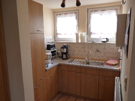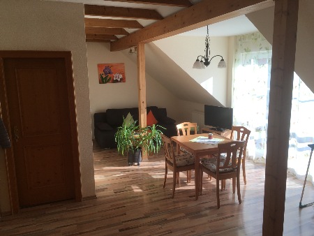 Helle, sonnige Wohnung mit einem französichen Balkon und mondernen Laminatfußböden sowie Flachbildschirmfernseher.