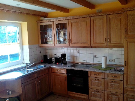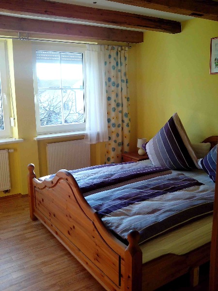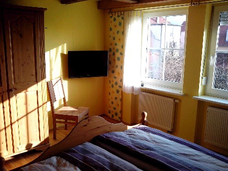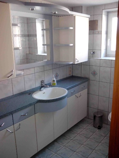 Badezimmer. Vom Bett des Schlafzimmers aus können sie den Staffelberg beim